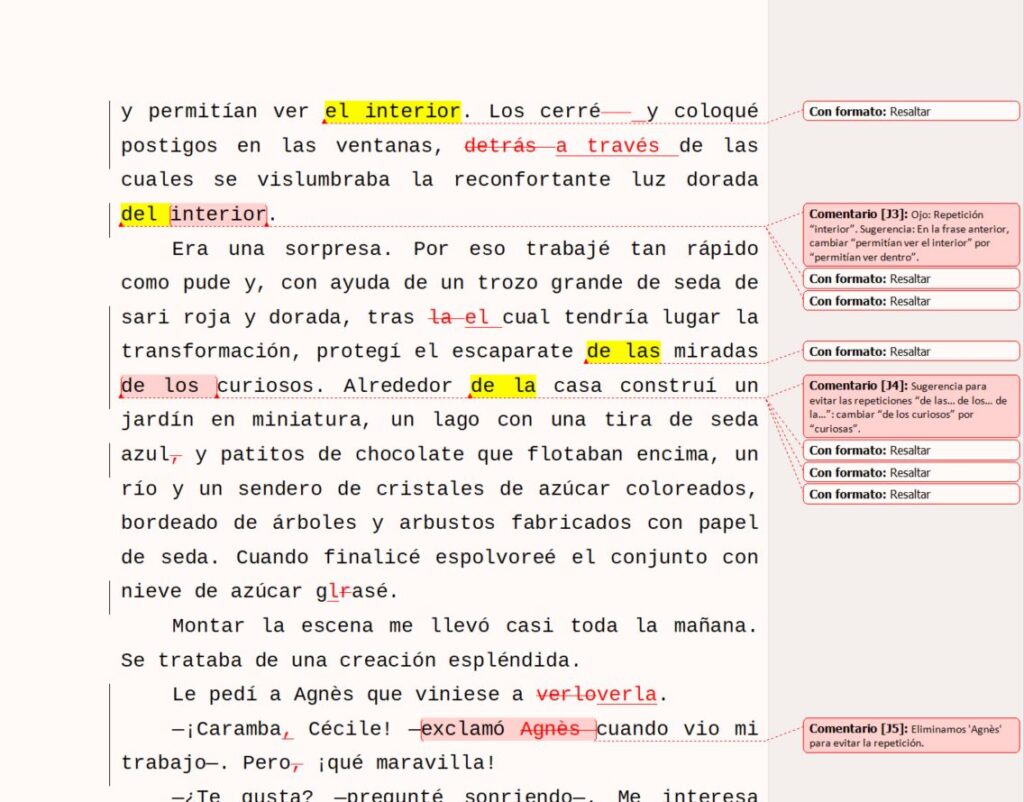 La corrección de estilo va un paso más allá y se mete en profundidad en el texto para dejarlo lo más claro, conciso y coherente posible, siempre sin interferir con la voz de la autora. Por ejemplo, se reorganizan oraciones enrevesadas para que sean más legibles, se ajusta el vocabulario para adecuarse al registro, se recolocan las frases de un párrafo para mejorar el ritmo, etc.